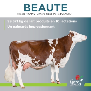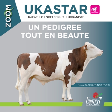 UKASTAR est né au GAEC GUTKNECHT en Haute-Saône. Il est issu de la famille de la célèbre Beauté (MICMAC) et on retrouve dans son pedigree, des taureaux très améliorateurs en mamelle (RAFAELLO / NOELCERNEU / URBANISTE / MICMAC).