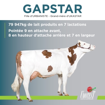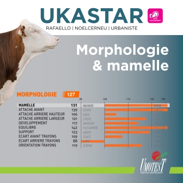 Disponible en semence sexée, UKASTAR ravira les amateurs de belles vaches à l’image de sa famille : 127 morphologie, 131 mamelle et +970 en lait.